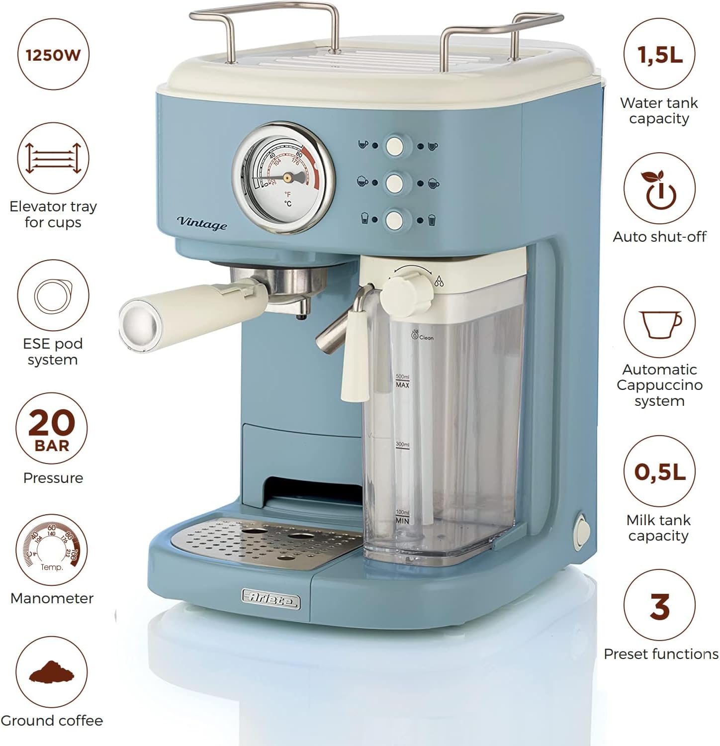 Ariete Vintage Espresso Otomatik Süt Hazneli Makine (mavi) Özellikleri: