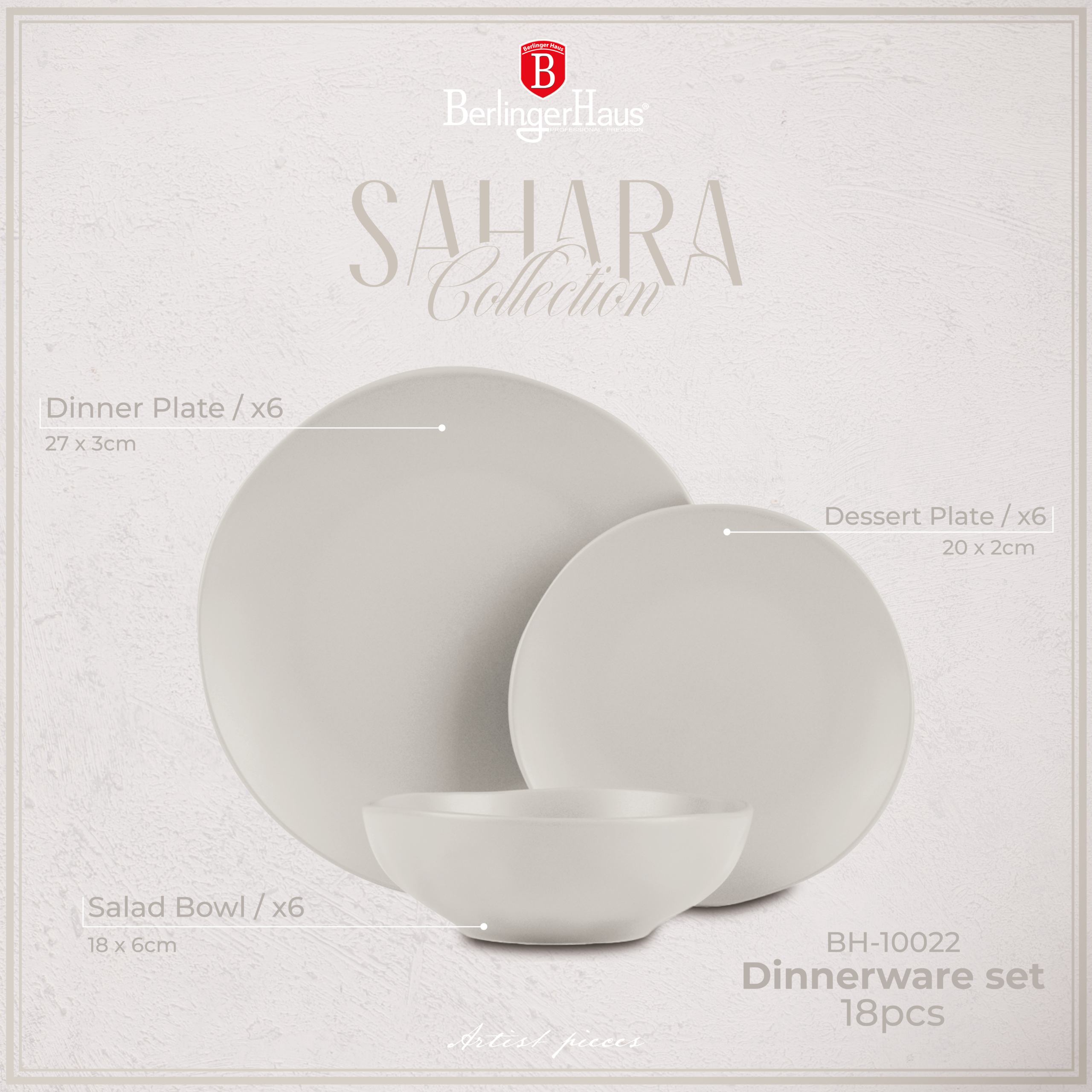 Temizlemesi kolay yüzeyi ve bulaşık makinesinde yıkanabilirliği mutfakta zaman kazandırır.Sahara Koleksiyonu sofra takımları fonksiyonelliğinin yanı sıra zarif mat krem rengiyle de öne çıkıyor. Bu setle leziz yemekler hazırlayın, kullanım ve temizlik kolaylığının avantajlarından yararlanın. Tek tip renk konsepti, mutfağınızı diğer BerlingerHaus ürünleriyle uyumlu hale getirmenize olanak tanır.
