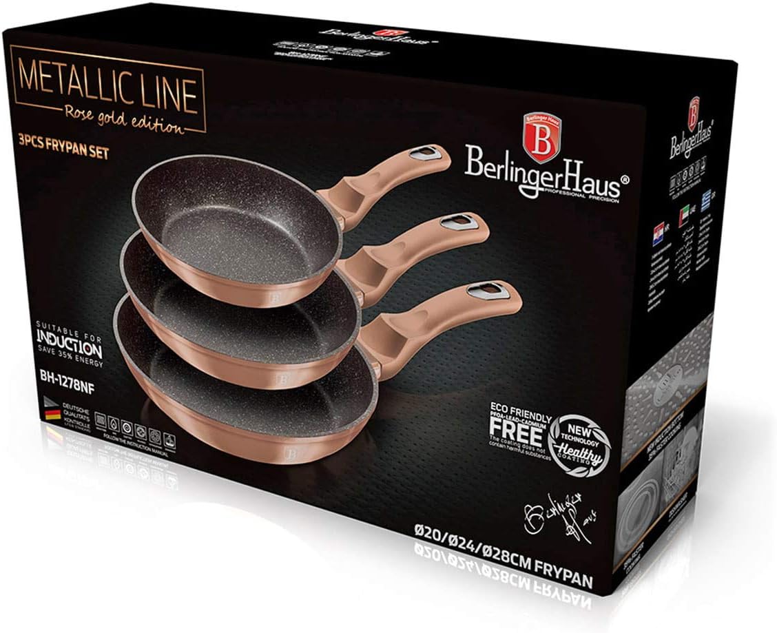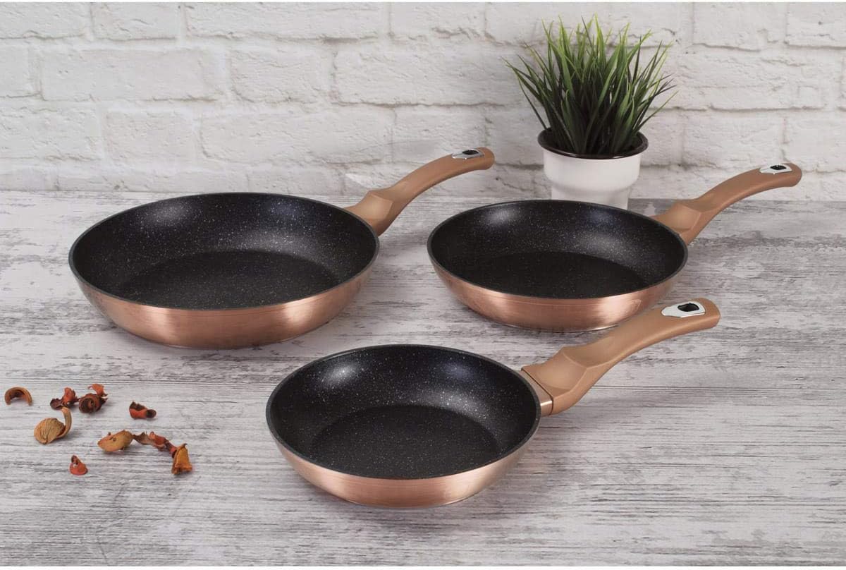 3 parça tava seti5.999.108.400.117• Malzeme: dövme alüminyum• Renk: metalik pembe altın• Tava Ø20*4,2 cm 1,0L• Tava Ø24*5,0 cm 1,7L• Tava Ø28*5,5 cm 2,4L• Ergonomik Yumuşak dokunuşlu tutamak• Dövme alüminyum kalın duvarlı gövde malzemesi• 3 kat yapışmaz mermer kaplama• Turbo endüksiyon tabanlı• İndüksiyonlu ocak dahil tüm ocak türleri için uygundur• Asılabilir• ECO dostu PFOA, KURŞUN, Kadmiyum içermez