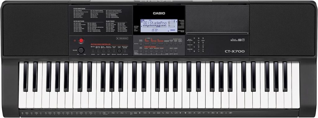 Casio CT-X700, devrim niteliğinde AiX Sound Source teknolojisi ile taşınabilir klavye anlayışını tamamen dönüştürür. Yüksek çözünürlüklü örnekleme ve gelişmiş DSP efektleri. 600 dahili ton, 195 dahili ritim, 160 dahili şarkı, ders fonksiyonu. Touch Response (3 hassasiyet seviyesi). 48 nota polifoni. 100 arpeggiator tipi. 310 Music Preset. MIDI Recorder: 6 track, 5 şarkı, 40.000 nota kapasitesi. Kokpit tasarımı ile kontroller doğal hissettiren konumlarda. Chordana Play uygulaması desteği. Teknik Özellikler: 61 tuş, AiX Sound Source, 48 nota polifoni, 20 reverb, 10 chorus, DSP preset, 2.5W + 2.5W amplifikatör, 12cm x 2 hoparlör, LCD ekran arka aydınlatmalı, USB-to-Host, Boyutlar: 948 x 350 x 109 mm, Ağırlık: 4.3 kg