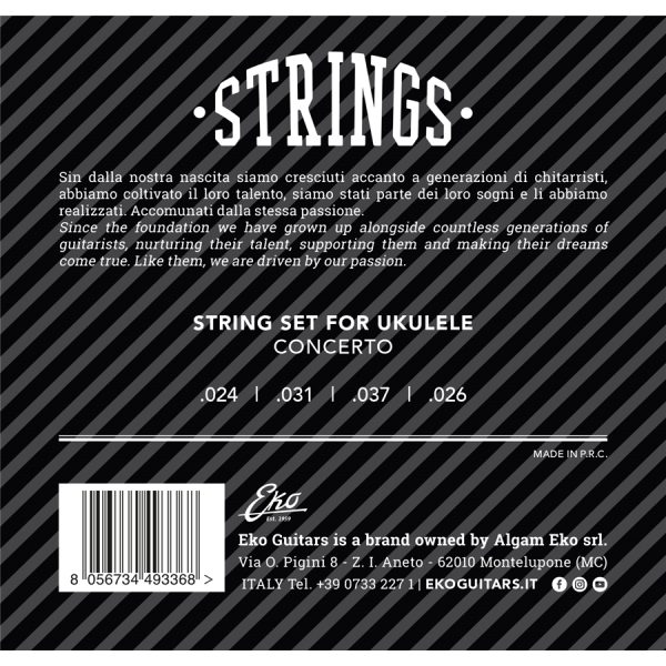Eko Strings ukulele concerto tel seti, concerto ukuleleler için özel olarak üretilmiştir. Yüksek kalite malzeme ve uzun ömürlü kullanım sunar. Tel kalınlıkları: .024 | .031 | .037 | .026