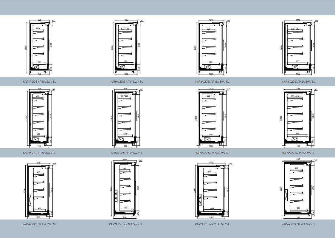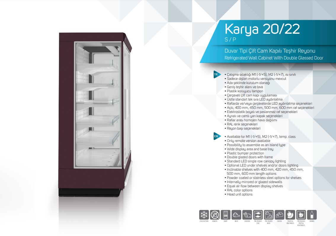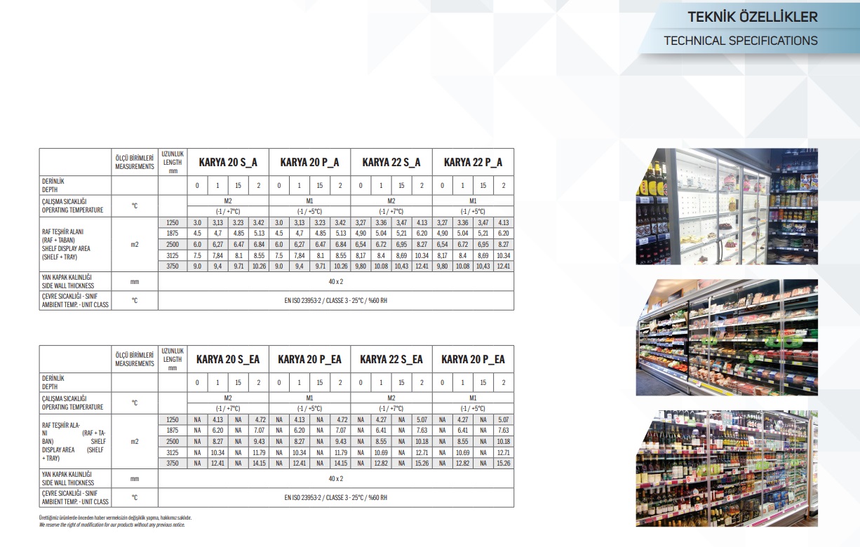 Çalışma sıcaklığı M1 (-1/+5), M2 (-1/+7), ısı sınıfı• Sadece dıştan motorlu versiyonu mevcut• Ada şeklinde kurulum olanağı• Geniş teşhir alanı ve tava• Plastik koruyucu tampon• Çerçeveli çift cam kapı uygulaması• Üstte standart tek sıra LED aydınlatma• Raflarda ve/veya çerçevelerde LED aydınlatma seçenekleri• Açılı, 400 mm, 450 mm, 500 mm, 600 mm raf seçenekleri• Elektrostatik boyalı ve paslanmaz raf seçenekleri• Aynalı ve camlı yan kapak seçenekleri• Raflar arası homojen hava dağılımı• RAL renk seçenekleri• Reyon başı seçenekleri