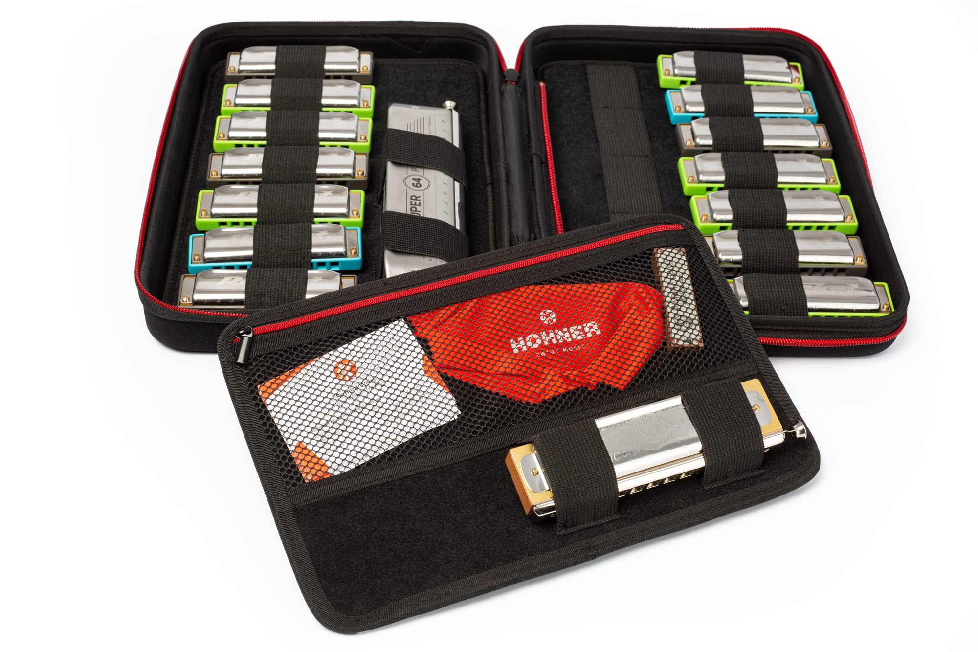 Hohner FlexCase M, oturum ekipmanları için kompakt, hafif ve sağlam bir saklama çözümüdür ve 7 adede kadar diyatonik mızıka için alan sağlar. Çanta, her mızıkayı ayrı ayrı koruyarak çizilmeleri veya ezilmeleri önler ve yeterli hava sirkülasyonu sağlar. Ayrıca, her FlexCase M'nin arkasında bir cırt bant şeridi bulunur, böylece iki tanesi birbirine bağlanabilir. Özellikler: Her mızıka için ideal koruma - çizilmeleri veya ezilmeleri önler ve yeterli hava sirkülasyonu sağlar. Güvenli tutuş - cırt bant bağlantıları güvenilir kapanış ve tasasız taşıma sağlar. Birleştirilebilir - iki FlexCase M cırt bantlarla birbirine bağlanabilir ve 14 adede kadar diyatonik mızıka için alan sunar.
