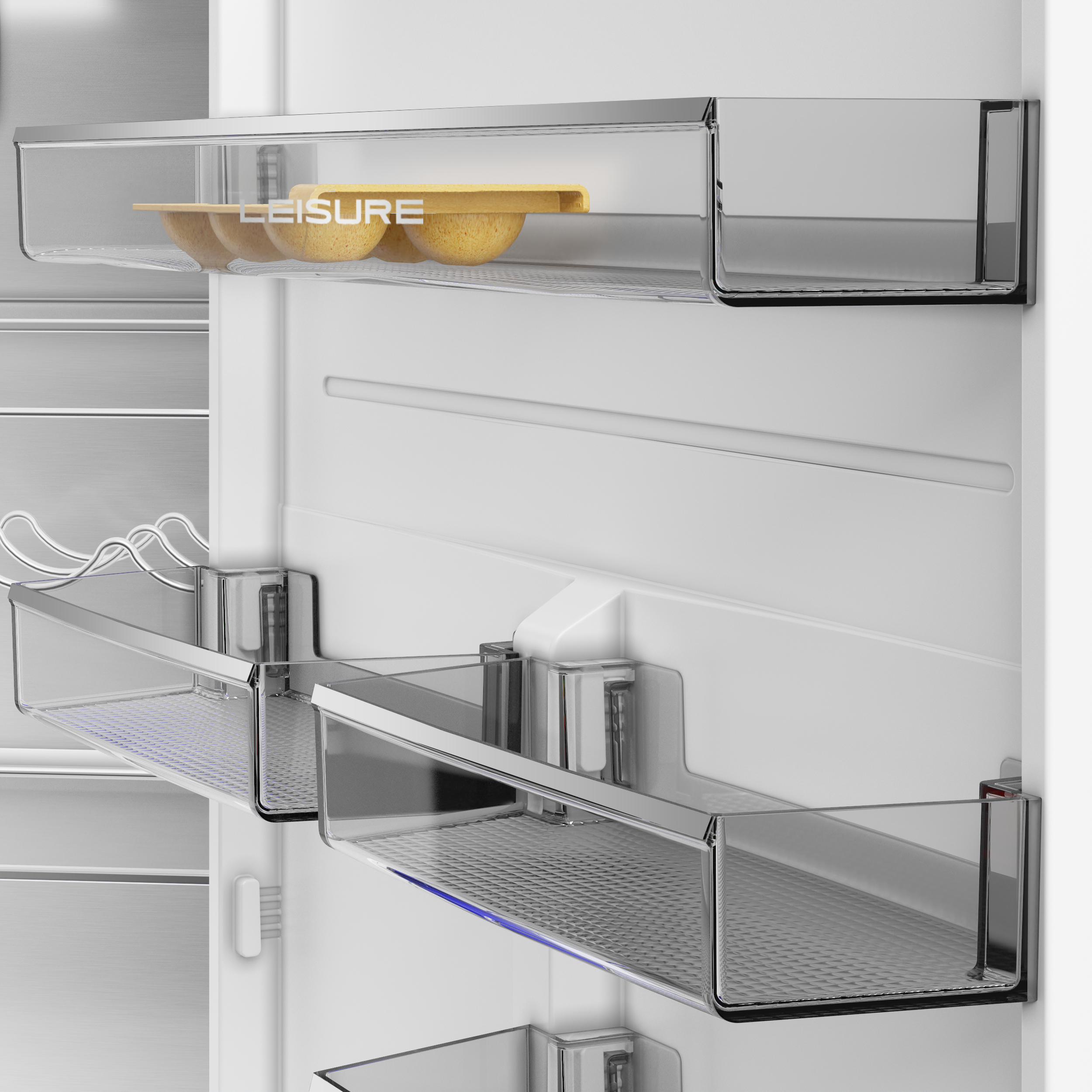 Kapı yönünün değiştirilebilir olması, farklı mutfak düzenlerine esnek uyum sağlarken; ayarlanabilir raflar, iç düzenlemeyi ihtiyaca göre kişiselleştirme imkânı sunar. LED aydınlatma, iç mekânda eşit ve enerji verimli bir ışıklandırma sağlar.