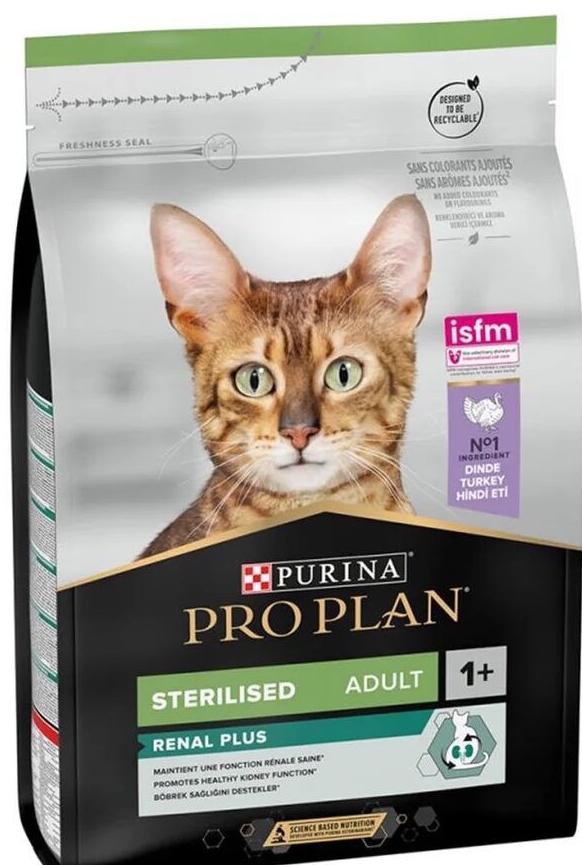Proplan Sterilised Renal Plus formülü, düşük magnezyum ve azot içeriği ile böbrek sağlığını koruyacak şekilde tasarlanmıştır. Mama, kontrol edilmiş kalori miktarı ile kısırlaştırılmış kedilerin ideal vücut ağırlığını korumasına yardımcı olur.