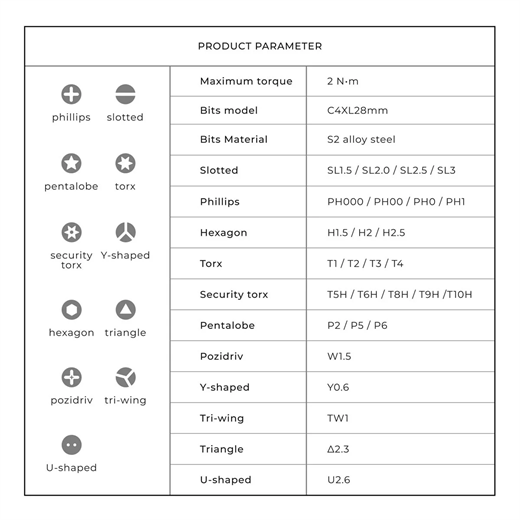 - 28 Hassas Uç (28 mm, C4): HOTO Hassas Tornavida 4 x Phillips Uçlu (PH000 / PH00 / PH0 / PH1), 4 x Oluklu Uç (SL1.5 / SL2.0 / SL2.5 / SL3.0, 4 x Torx B it (T1 / T2 / T3 / T4), 5 x Delik Uçlu Torx (T5H / T6H / T8H / T9H / T10H), 3 x Beşgen (P2 / P5 / P6), 1 x Y Tipi (Y0.6), 1 x Tri-Wing (TW1), 1 x W Tipi (W) 1,5), 1 x Altıgen Başlı Uç (H1.5、H2.0、H2.5), 1 x Üçgen: 2.3), 1 x U Tipi (2.6).